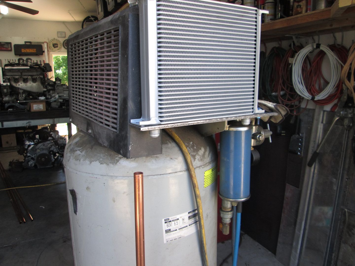 There are 3 parts to this modification. 1. Modify the tank for the inlet to be low on the tank and induce a spiral flow of air around the tank, with the outlet of the tank being in the top center. 2. Heat exchanger with 9" fan between compressor and tank to remove heat from the air and condense as much water as possible. 3. Route the outlet of the tank through a significant length of copper pipe with water traps to further cool the air and remove any water.
