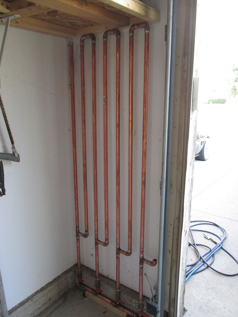 Part 3: Here is my prison door... The outfeed from the tank will enter the top left corner of this assembly. With all the vertical drops, climbs, and water traps at directional changes, as the air flows through this assembly, it will cool and moisture will condense along the walls of the tube and drain into the traps. There are valves at the bottom of each trap to a common drain channel. I still need to mount it to some 2x4s along the wall, and finish all the connections, but you can get the general idea. All the tubing is 3/4", the main vertical portions are 48", the spacer sections between all the elbows and "T" fittings are 2 1/2" and the water traps tubes are 11 3/4". Overall height is about 67 1/2" tall and about 25" wide.