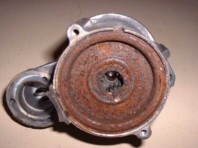 On to the gearbox half of the starter: The gearbox is separated from the motor with a plate that’s supposed to keep the grease off the motor. Mine was kinda rusty looking so I took it off and sandblasted and refinished it. Here’s what it looked like with the motor half removed.