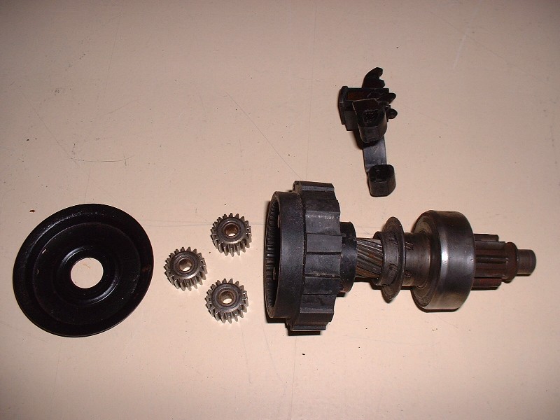 With the cover removed (it’s just held in place by a tab), you can pull three little planetary gears out, and retract the entire gearbox’s guts from the housing with a little persuasion. In this case, the sun gear is part of the armature shaft, which meshes with the three sun gears that spin on pegs that are welded to gearbox’s input shaft. This gears down the RPM of the motor and multiplies the output torque. The gearbox stator is kept from moving by having big plastic teeth or splines that engage the ID of the housing. That’s the part that needs a little coaxing to get the guts out. The other major assembly in the gearbox is the solenoid fork which acts just like a clutch fork. Here’s what the major parts look like once cleaned up: