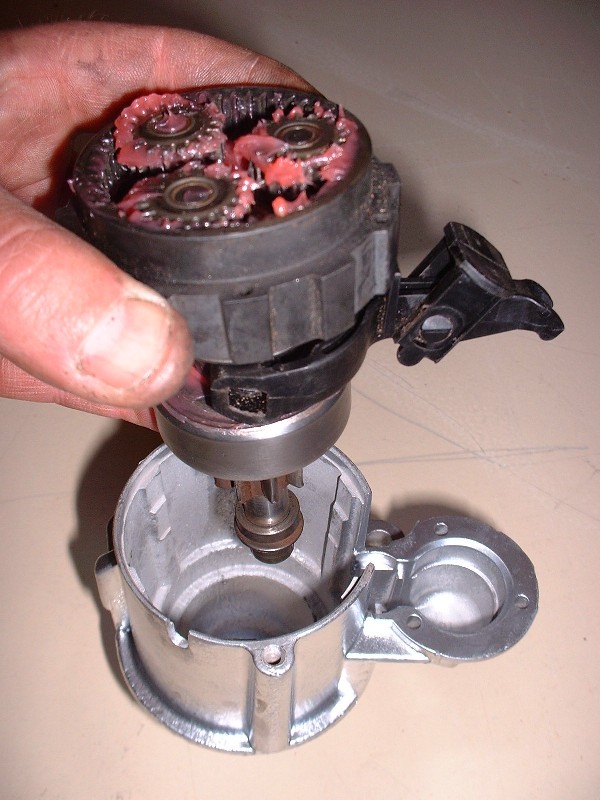 Then installed the three little planetary gears in the plastic housing and lubed them up good. At this point the pinion assembly was ready to be installed back into the gearbox housing.