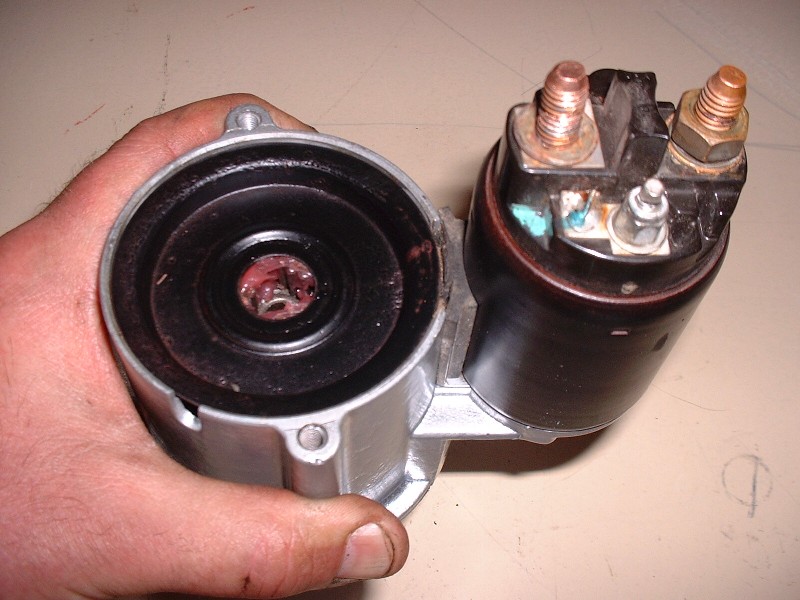 It took a little persuasion to get the black plastic planetary gear housing to seat properly, and once it was into place, I realized why. The little yoke that the fork pivots on was binding up so I had to pull it all out again and take a little more care in aligning the yoke into it’s recess. If you take one of these apart, make sure before you close it all up that the little lever that the solenoid is connected to can actually pivot freely to slide the pinion gear back and forth.