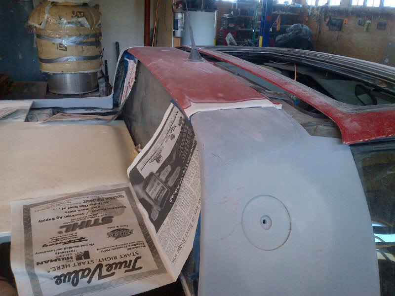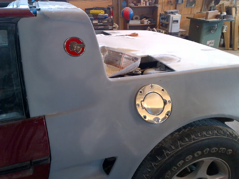 Chief Pontiac emblem and the filler cover mounted. There's a fair amount of work in making the filler cover fit, since the body panel doesn't have much flat surface to start with.