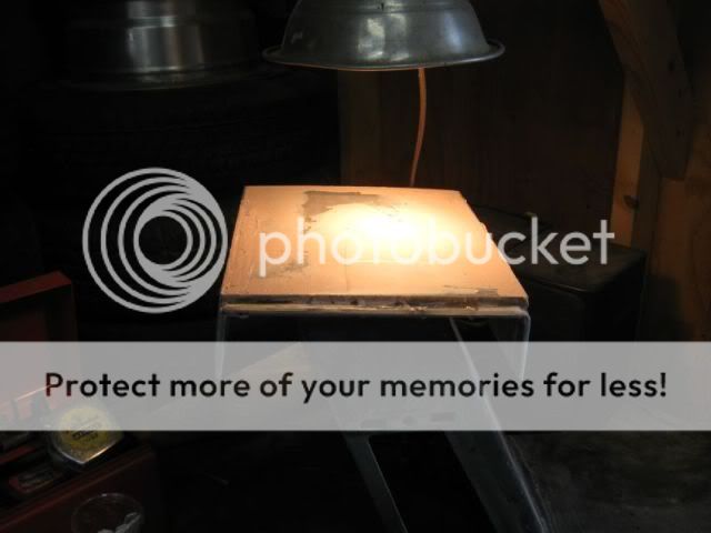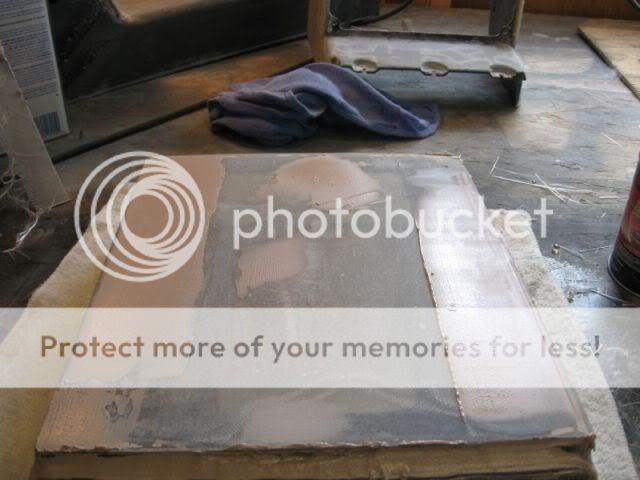 First skim coat of filler - along with the low spots, there were several air bubbles to fill. It was cold here today so I put the heat lamp on it to help it cure.