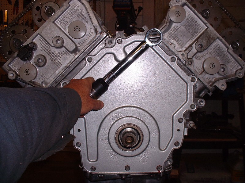The cover gets torqued on (you guessed it) to 89 in-lbs starting at the bolt I’m torquing in this picture, and going around successively to the next bolt in a clockwise direction until you’ve done all fifteen. Then, if you’re smart, you go over them one more time. The service manual states that a thread locking compound must be used on these so I used the high temp red Locktite left over from my head bolt inserts.