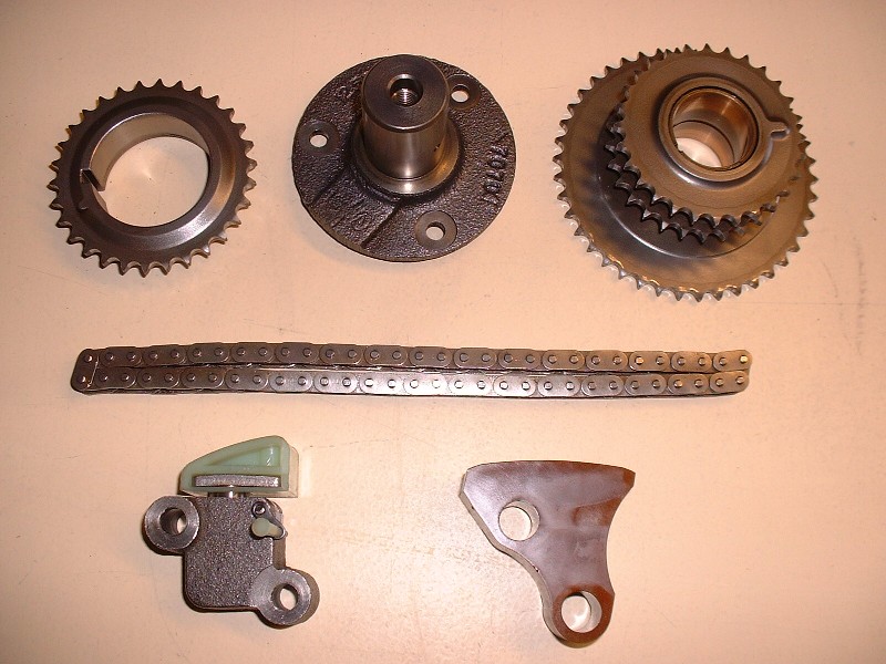 OK, so with the starter out of the way, I moved on to the valve timing components. It was a lot more intimidating and time consuming to read through the process than it was actually doing it. Once all the parts were cleaned up and inspected, I opted to keep all of the original timing components except the primary chain tensioner. If you've been following from the beginning, you'll remember why. So here now are the components that form the primary timing chain assembly from top left to bottom right: crank sprocket, intermediate sprocket set journal assembly, intermediate sprocket set, chain, tensioner, and guide.