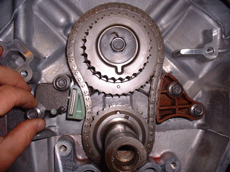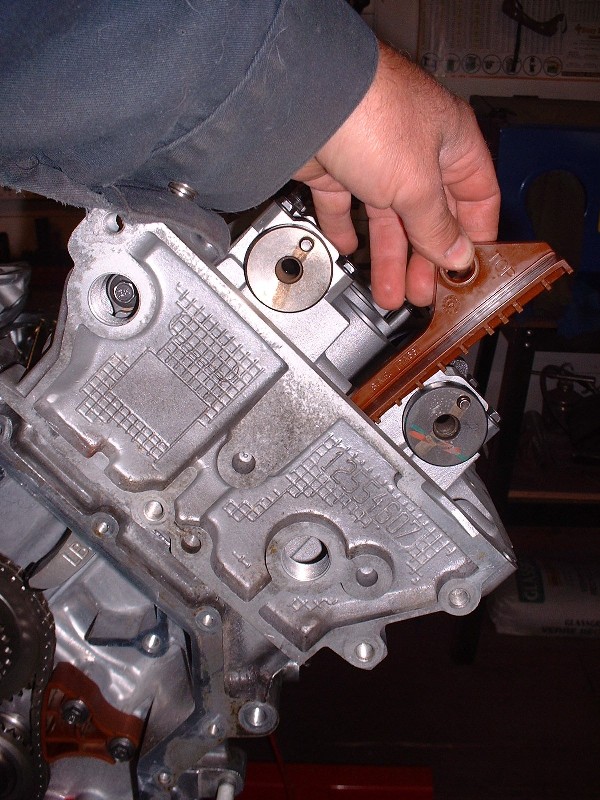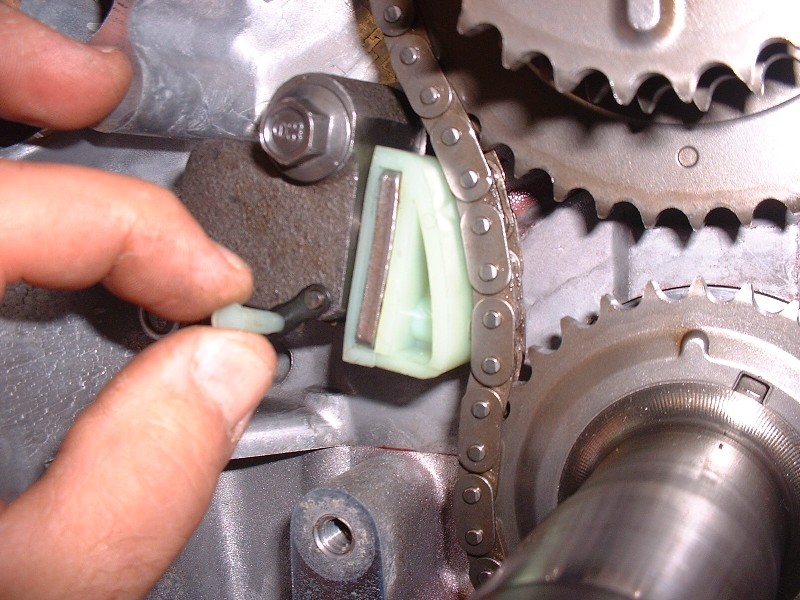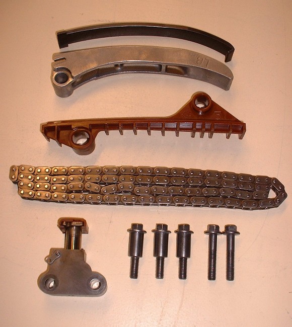 Here are the main components of the secondary timing chain system from top to bottom: replaceable upper chain guide shoe; upper chain guide; lower chain guide; chain; and tensioner.
