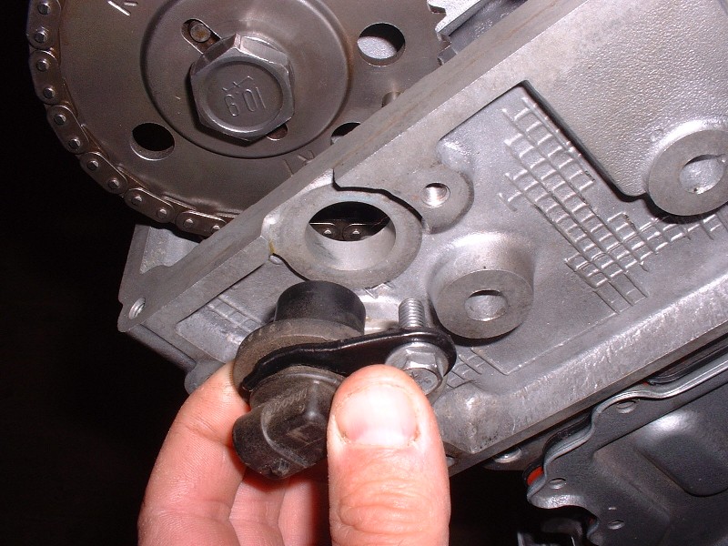 I’m back after a short break working on a ’67 GTO convertible… almost done. So after the chains were in place, I installed the camshaft position sensor in the hole next to the rear head exhaust cam sprocket. It senses the passing of the little metal pin on that sprocket for timing purposes. Like all of the the M6 bolts, the sensor hold down bolt goes on with 89 in-lb of torque. The difference with this little guy however is that it goes right through to the innards of the chain case so it needs a little dab of RTV on the threads to keep it from leaking.