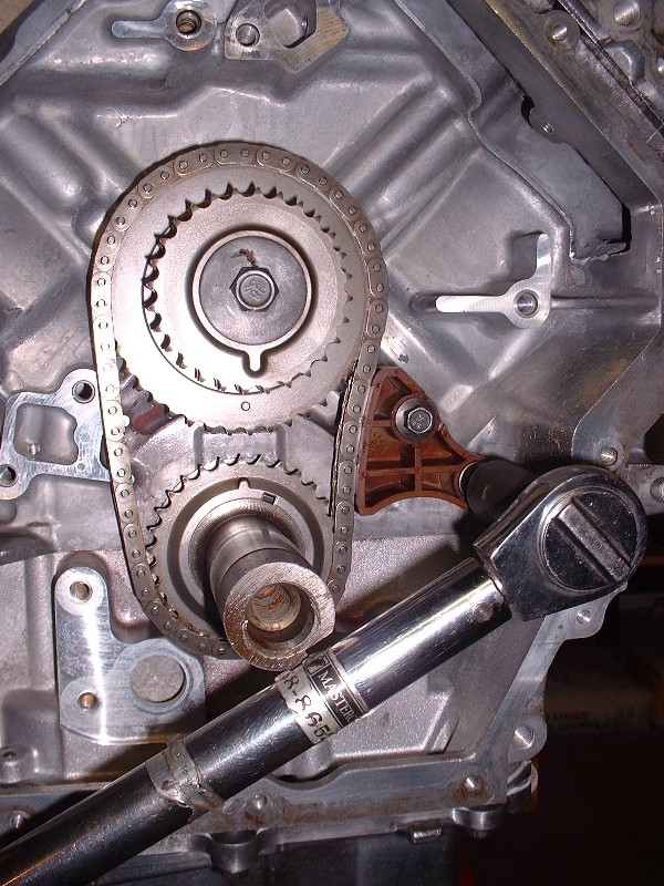 Once that’s done, then slip the intake cam sprocket onto the chain so that when it’s installed on the intake cam, that there’s no slack on the chain segment between the intake and exhaust sprockets. To do this, you may need to reposition one or both cams a little using the wrench because if either cam pin isn’t perfectly at 90* you’ll find it impossible to install the chain without it sagging between the sprockets.