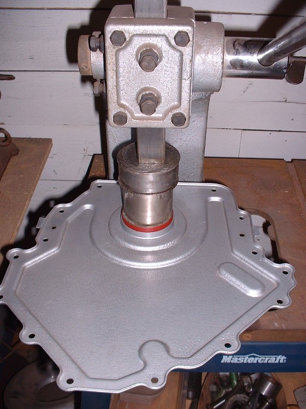 Before the chain case cover can go on, there’s a couple things you have to do. The first is to replace the front crank seal in the cover. Getting the old one out was a cinch… I just used my arbor press and pressed it from the front side, out through the back side. If you haven’t got a press, then a few carefully placed hammer blows with a punch would do the trick.