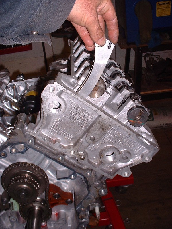 So once the upper and lower guides were in, the next step was installing the cam sprockets, as before. Except that one of the rear (right) bank sprockets has a pin on it that none of the others do. It pays to notice the little things because no mention of this is made in the Service Manual. The pin is part of the camshaft position sensor circuit. The sensor gets installed on the side of the head where the exhaust cam is (at least that's where the hole is!), so it became pretty obvious which sprocket had to go where.