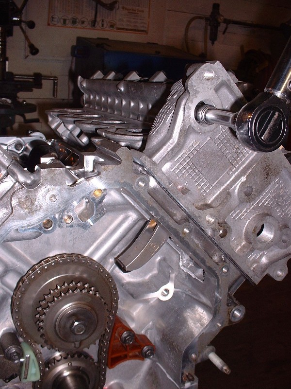 There’s a fair bit of slack in the chain at this point, so you want to make sure that the chain is tight on the side that gets the guide, and loose on the side that gets the tensioner. Here’s me installing the guide and torquing it to 18 lbft.