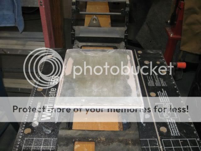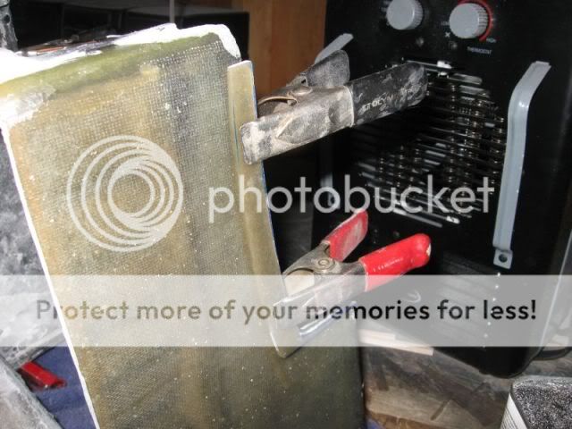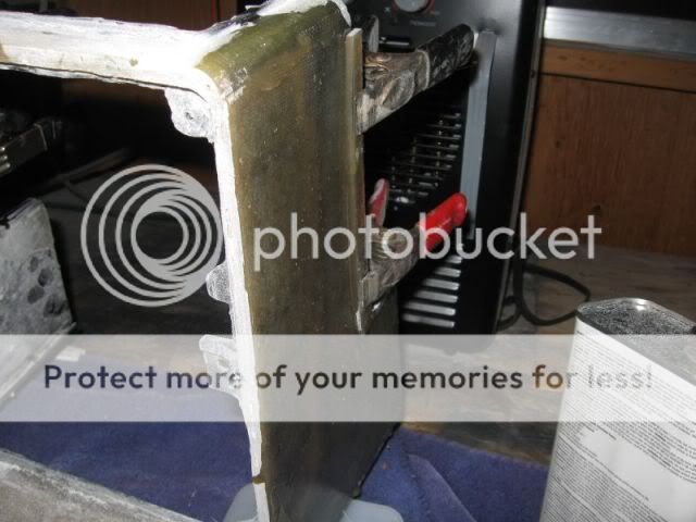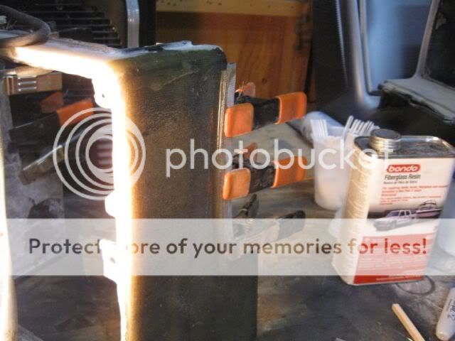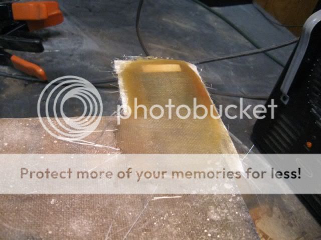 I did not get any pics from last night but here's one of the side I did today. Once I had the glass layed, I placed wax paper on top and rolled the air bubbles out. Then I put a piece of harwood veneered plywood on top of the wax paper and clamped it down with some spring clamps. After it sat for 15 minutes, I removed the clamps, wood and wax paper - the result is wonderful. Nice flat smooth with no air bubbes to fill.