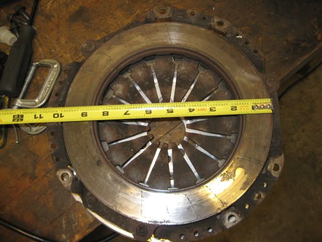 I was able to stop by the junk yard and get a used clutch from the application I think will result in the largest possible clutch. The transmission was already pulled, so 6 bolts and it was mine (plus $30). The pressure plate surface is about 9 7/8"
