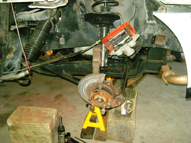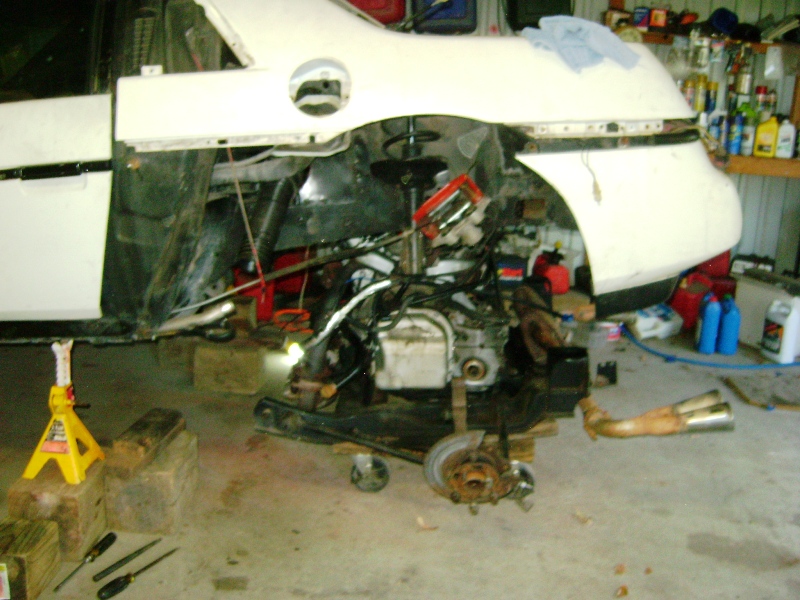 Nothing done on the car today. I will be out in the garage tomorrow morning around 7am trying to get everything underneath it re connected. Pointing on trying to get it back on it's wheels again. -Joe