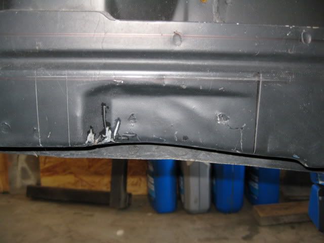 In addition to the rear cross-member, the factory exhaust notches in the cradle needed to be modified slightly. They were shortened about 3/8" and reshaped to better clear my exhaust pipes. This modification allows the Magnaflow muffler to fit without any modifications to the stock trunk. In this pic the bottom portion has already been cut back and the marker outline shows the amount to be removed: