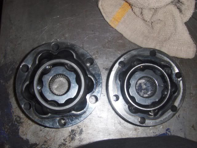 I made some progress today. i had an early start, but then had to tend to customer's vehicles. Tomorrow is 10 hours of pure VR6 work, though. Anyway, I took a pic of the new inner CV joints. You can see the size difference between the O2A and 02J transmissions. The 02J which I am using is on the left.