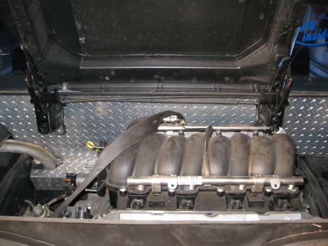 Here is the clearance to the decklid hinge box... but the water pump isn't on the engine.