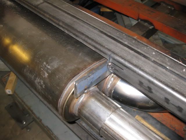 Tacked the muffler to the cradle in its proper position so I can fabricate the rear manifold tube on the bench vs. under the car.