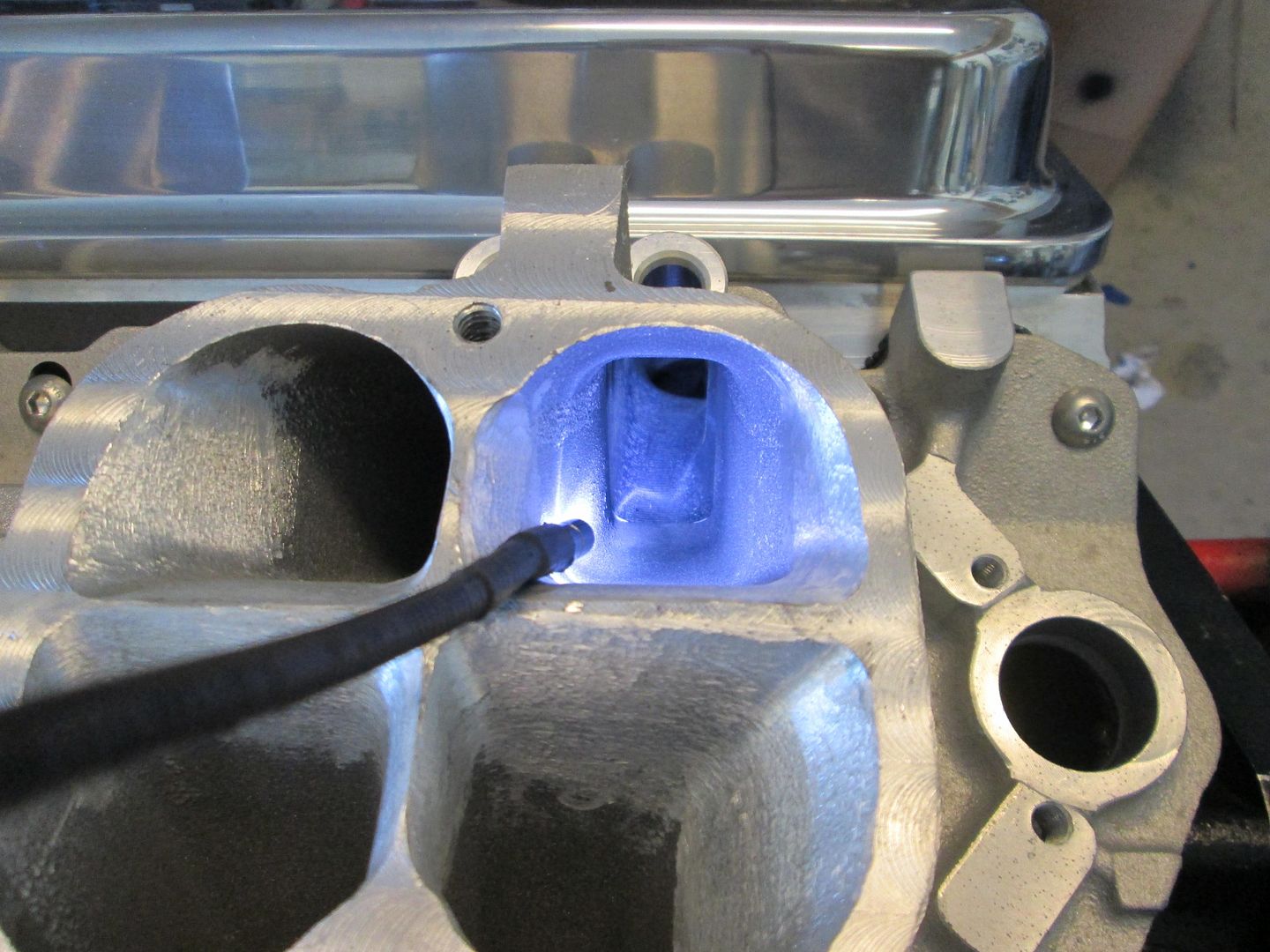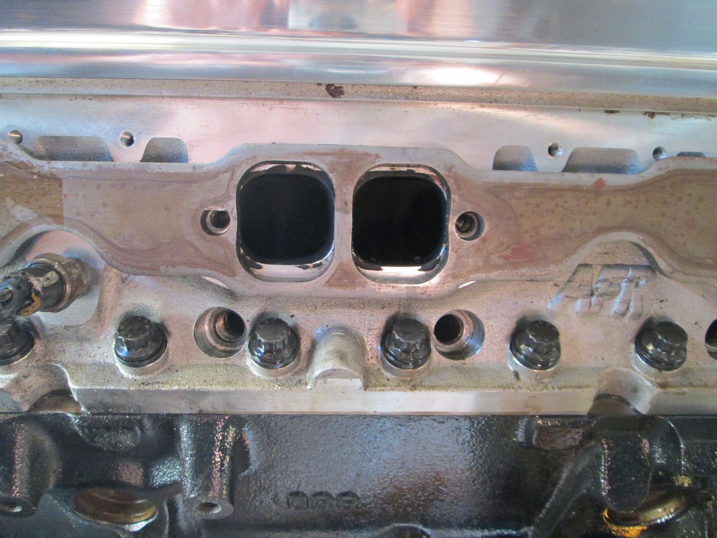 The bolts for the valve covers were about 1/4" too long to tighten the valve covers, so I shortened the 8 bolts, dumped a quart of oil over each bank and installed the valve covers. Next was to install the lower intake, I dumped 2 quarts of oil over the lifters, installed the intake gaskets, installed the intake, lined up the intake runners to the head ports (with a tunnel ram you can "see" the alignment), then torqued it down. All the ports looked like these two with just a slight portion of the lower corners of the head protruding past the ports on the HSR.