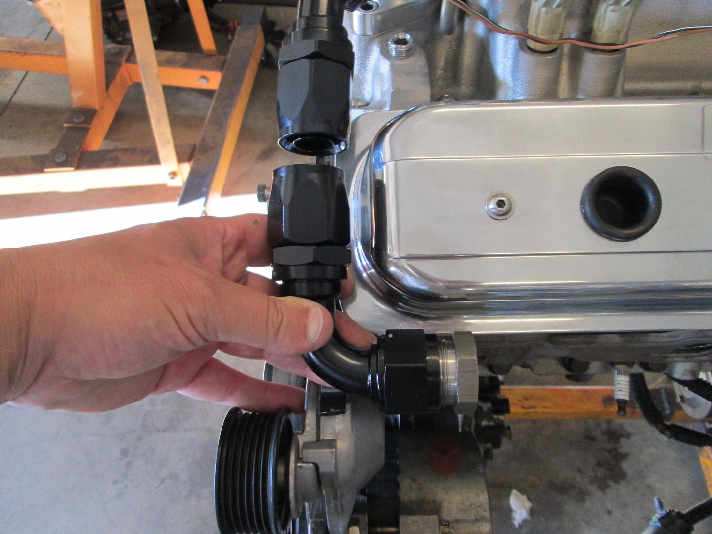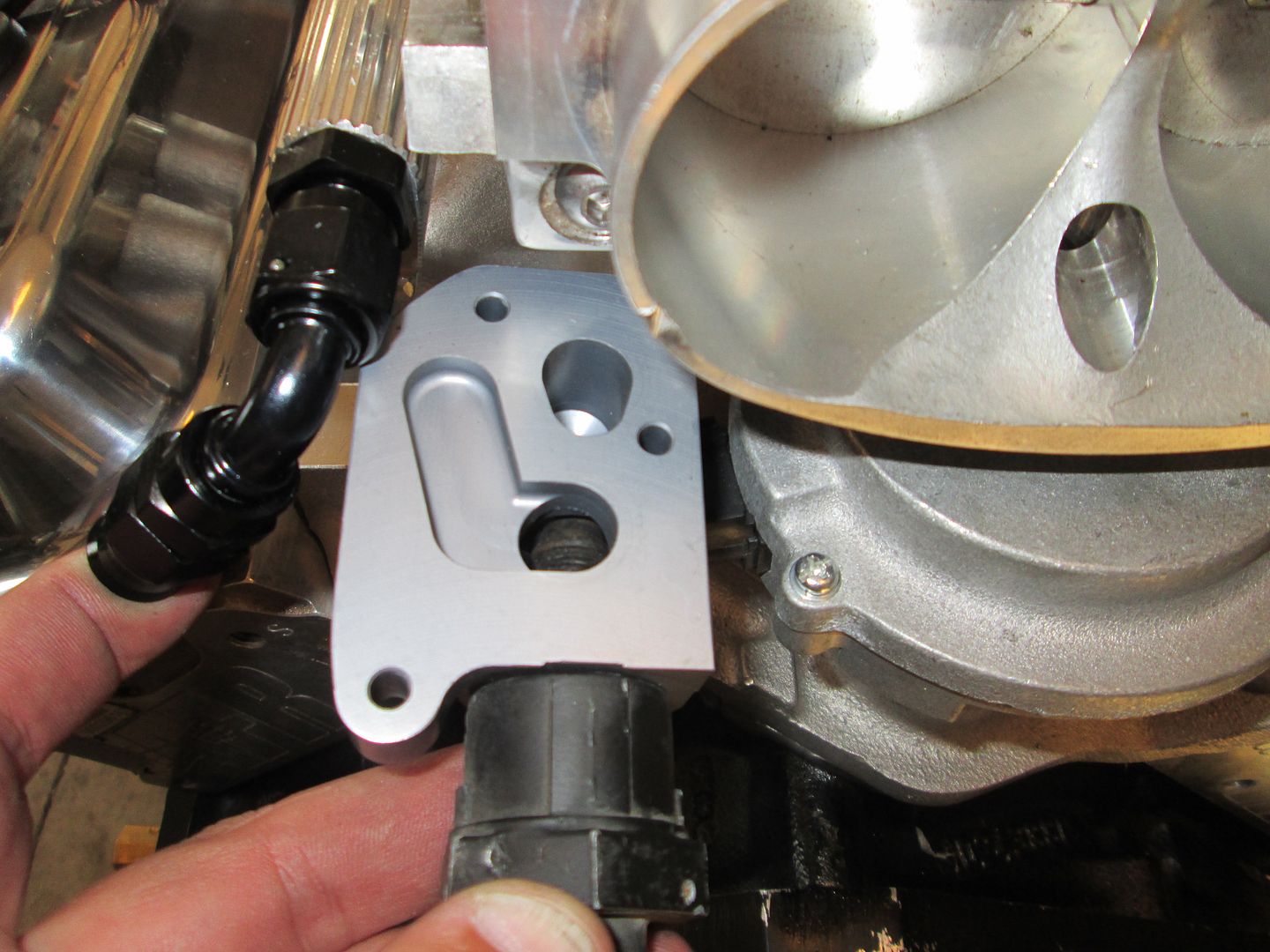 I am in the process of filling all the extra coolant ports and vacuum ports with chrome plugs. This picture also shows the coolant fill and the -16 AN fitting.