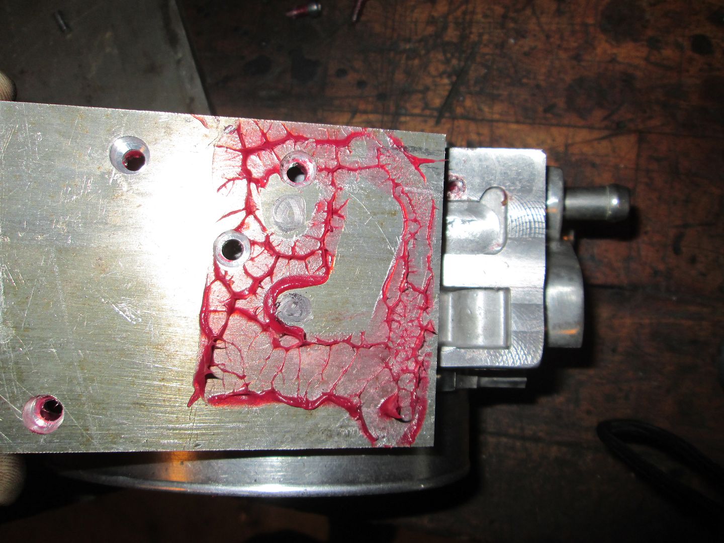 Here is an underside picture of the existing passages in the throttle body. I will need to face it down to the as cast corner so it will seal up well. Then cut a path from the port on the right to the right corner pocket. Then cut a passage from the port on the left to the existing passage on the left: