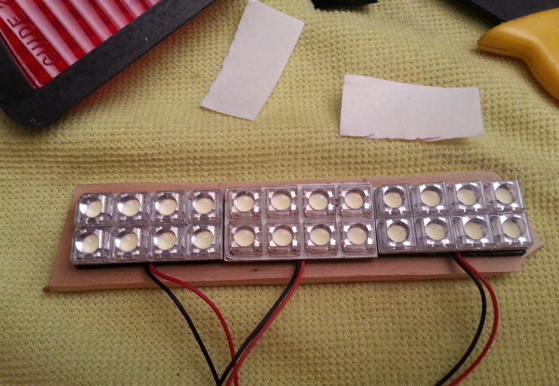 I cut the wood down to the correct size to fit in the 3rd brake light housing. I wanted the LED's back about a 1/4 inch from the lens, and not directly mounted to it. This allows for some light scattering, and fills the whole lens with light, and you do not see just individual LED's up against the lens. I then peeled the sticky backing off the LED panels, and stuck them to the paint stick: . . To make sure everything was secure, I ran a bead of hot glue around the edges of everything: . . The end result, nice BRIGHT brake light, and no more melting the housing from the heat of the bulb! It is much brighter that it looks in the picture, as my S3's camera reduced the shutter time to compensate for being pointed directly into bright lights! (The same work lights are still on in this photo, the same as the above photo's)