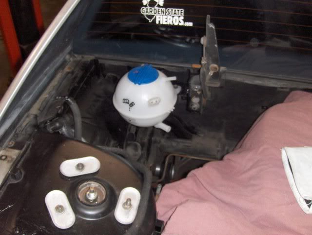 I welded a bracket where the FP and A/C relays used to go. Painted it and then mounted the expansion tank to the bracket. This has to be the highest point in the cooling system and can't hit the vent above it. Kind of tricky, but I got it just right on the first try.