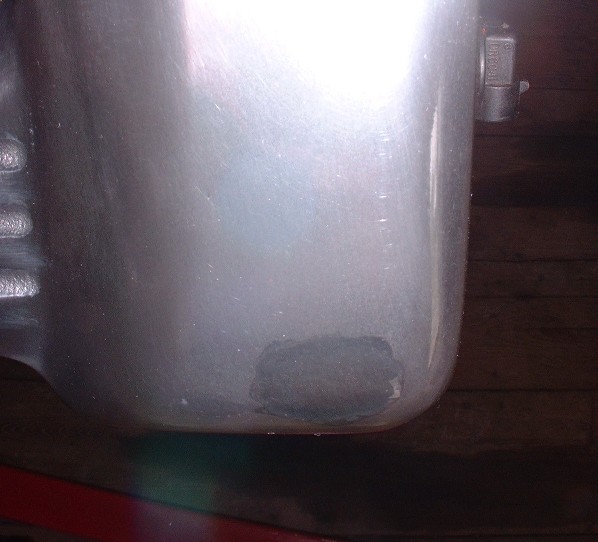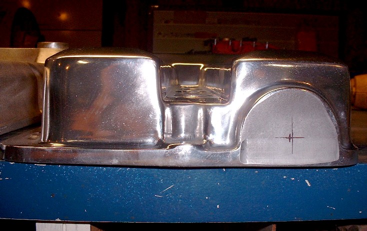 Problem #2 was that there is a dark spot on the rear cam cover… the cover that’s seen in a Fiero. It appears as though there must’ve been a casting void that was later filled by welding, and then an attempt to polish it out. The filling was well done, but there’s an undeniable blemish. You can see the area I'm talking about in the last two pictures of my last post in the bottom valve cover at the bottom right corner on the sprocket hump. Here's a close up look: