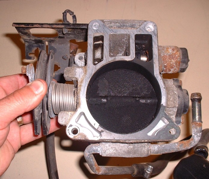 And here’s what lurked behind the throttle plate… there was enough carbon built-up to choke off an industrial incinerator in that thing. Clearly oil was getting into the combustion chambers and leaving a mess in the intake via the PCV and IAC port.