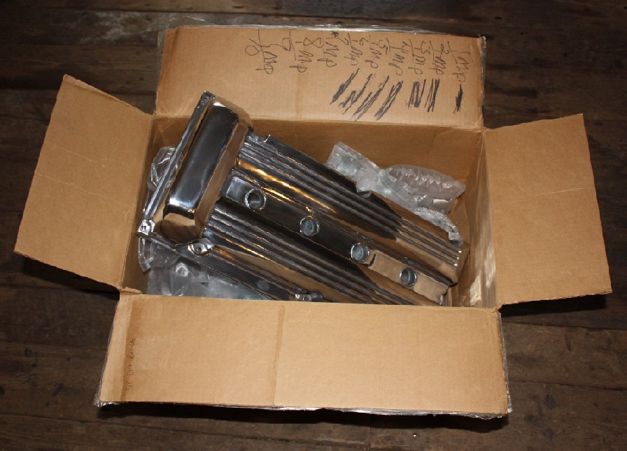 I seriously considered spending upwards of a hundred hours shaving warts, sanding the pebble finish, and polishing these two fraternal twins into something befitting of a Ferrari's engine bay, but I just couldn't picture any amount of plastic surgery that would cut the biscuit. So, I broke down and phoned CHRFab three weeks ago. A couple days ago I got a parcel-delivery notice in the mailbox. I like parcels (even if this one came with an additional invoice that I owed $107 in federal and provincial taxes before the post office would hand it over). I was surprised at how heavy the box was... secretly I was hoping that they accidentally sent me two pairs of valve covers, but that was not to be. I was happy when I opened the box nonetheless.