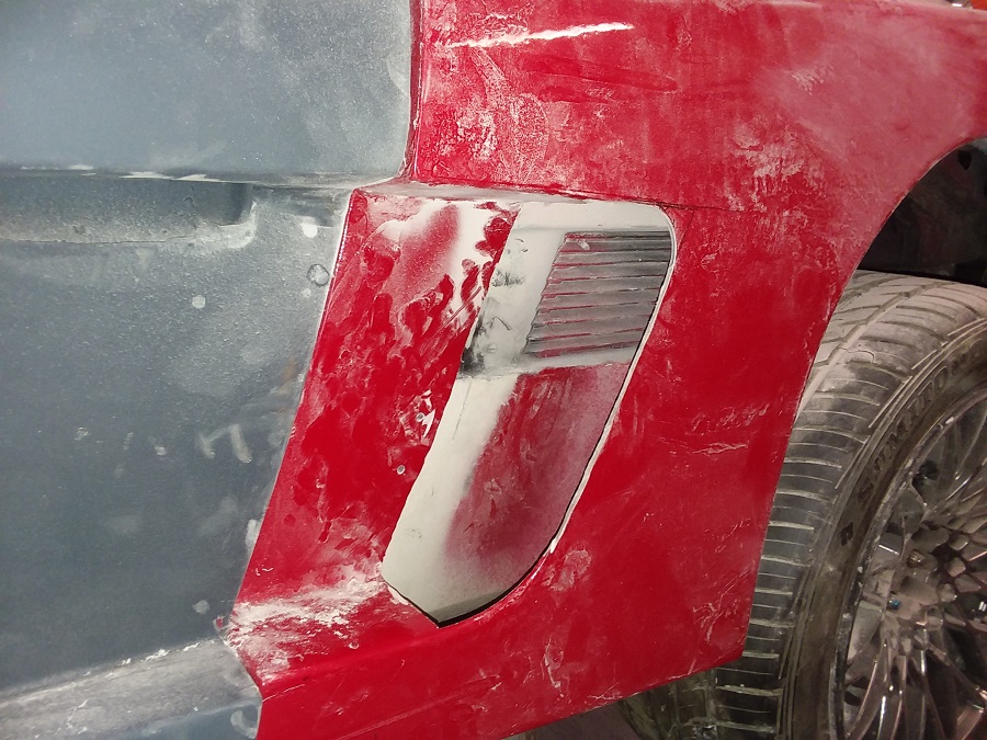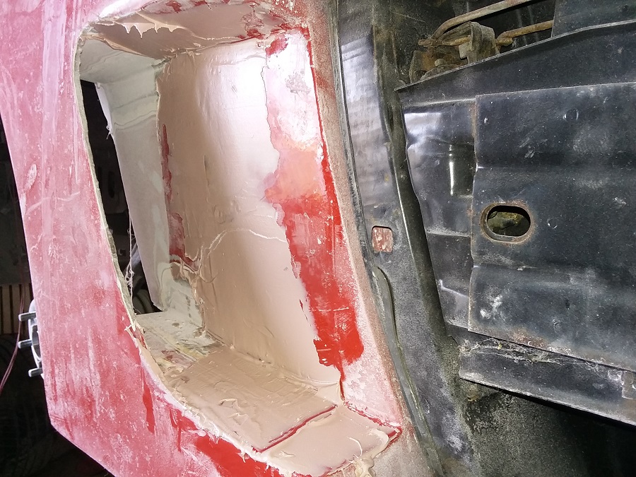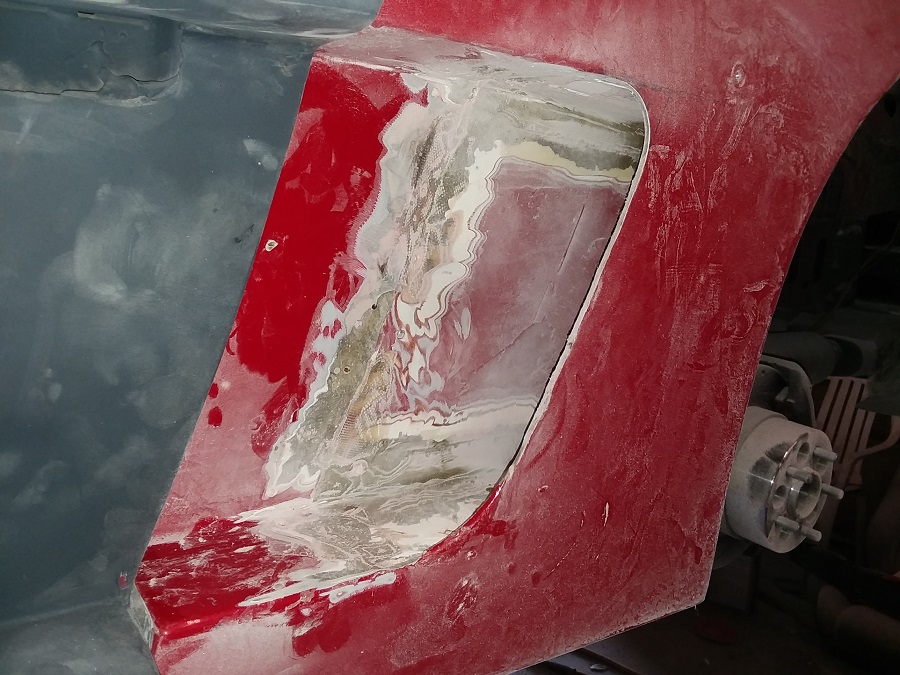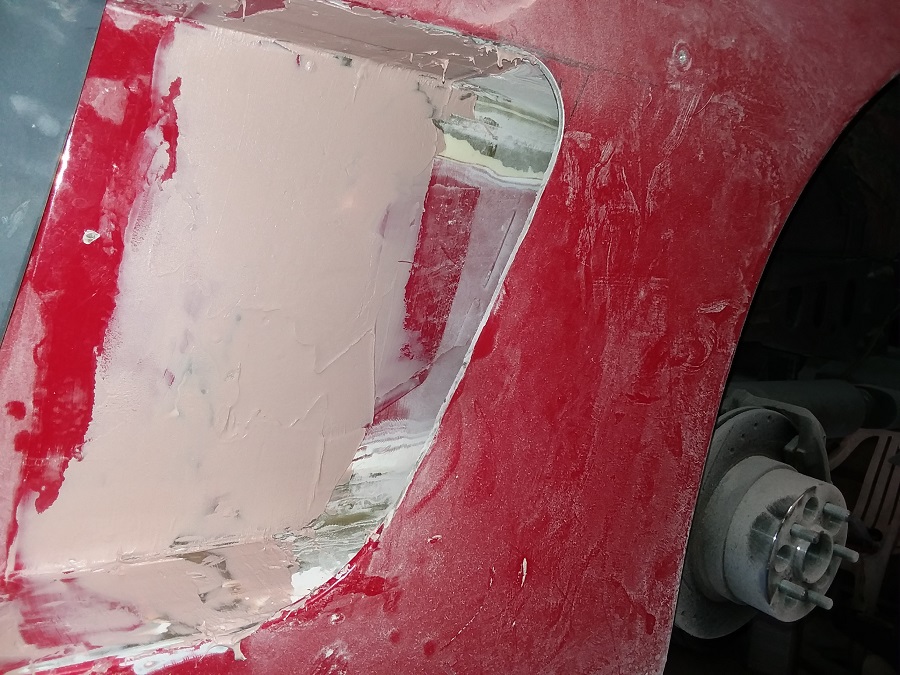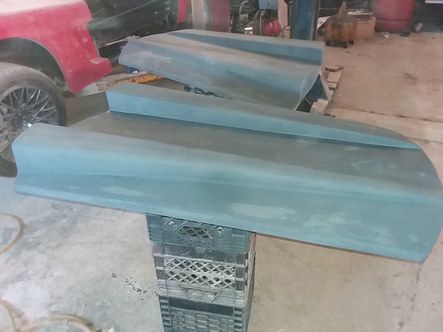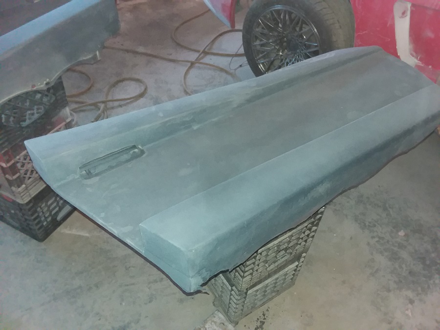 Today i started to work on the quarter scoop area and it is coming along good as i am making some scoop pieces out of some flat fiberglass from the old trunk lid