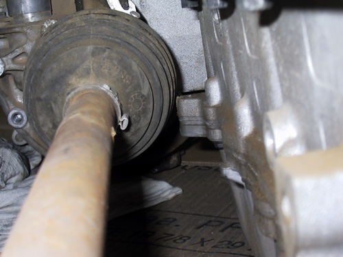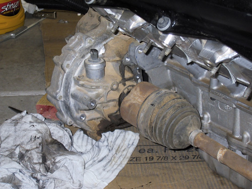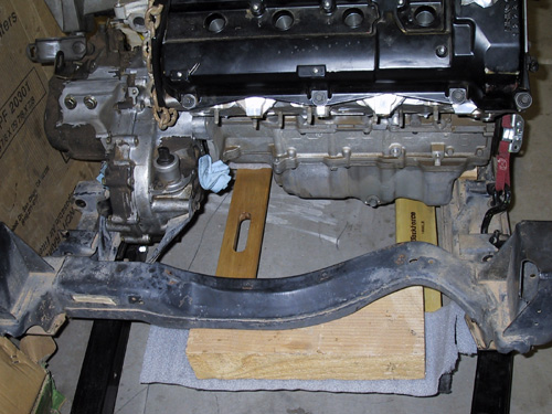 i put the engine on the cradle today with the trany in the stock mounts. the front of the engine was resting on a couple of small pieces of wood on the cradle. the front of the engine was about 3/4 to 1 inch higher than it will be when mounted. i slid the cradle under the car and started lowering. suprise! the usual laundry list of stuff to be done. passenger side decklid hinge support will need trimming. the decklid support spring will need to be removed. a gas strut added to the pass. side to hold the decklid up. the dogbone mount will have to go. some trimming may have to be done to the pass. side strut tower. in addition to the clutch arm needing to be changed to pivot further back and the slave mounted to match. I thought about moving the trany further left but the left axle is so short, i will try not to move it more than 3/8 to 1/2 inch. hopefully the tripots have that much play. if not then i wont move it left at all. the foward cradle crossmember will be cut out and a new crossmember welded in several inches forward of the old location. pretty much the same stuff everyone else has been doing looks like the way to go. got a question regarding the izuzu trany input shaft. it looks like the shaft is too short for a t/o bearing. is this true? there is only about 1/8 inch of material forward of the clutch splines. does the getrag use a t/o bearing? maybe the flywheel is thick enough to make up the space between the crank and the input shaft... i will look at the duke to see what they did there...
