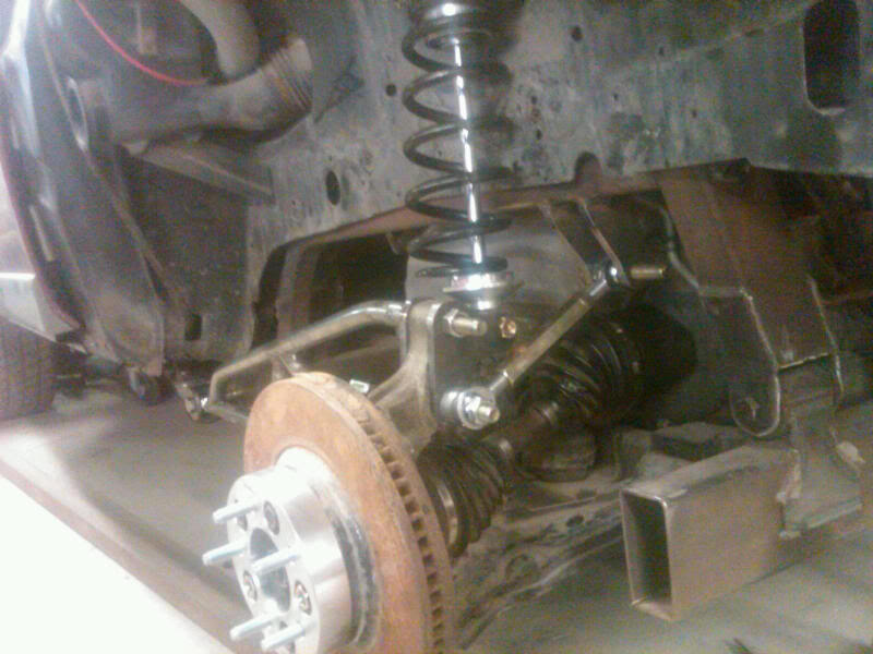 Front shocks mounted! Notice the S10 brake calipers on the custom brackets, connected to the early Pinto spindles. The lower A arms started out as a part from HT motorsports and got tweaked from there. The upper A-arm is hot rod stock for chevy.[This message has been edited by artworks (edited 07-14-2017).]