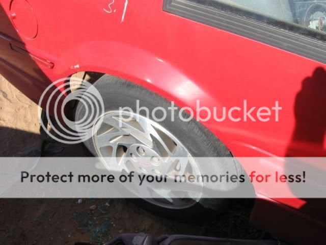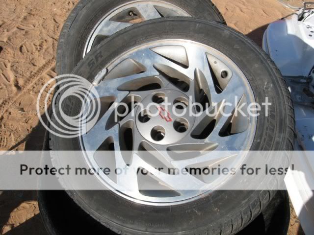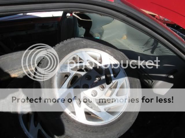 I had to come home and get a jack and a lug wrench so I could go back and get the wheels. As I was carrying the Jack into the yard, a guy stopped me and told me that I could not take the jack into the yard....WTF? So I threw the jack back in the truck and headed out to the car anyway. The fronts were alrady off. I took the lug nuts off the rears and then tried to figure out how I was going to get the car up to get the wheels off. The car was sitting on the chasiss in the sand so I dug the sadn out from under the tires till the suspension was hanging then I was able to get them off. I did not want the beat tires that were on the rims so I had the guy at the yard remove them. I had 3 perfect condition center caps. The first one he trows up on the tire machine and puncded a hole in the center cap. Then he beats the heck out of the rim gettin the tire off. Then he litterally throws the rim off the machine onto the conrete floor. I say "hey man, I want the rims, take it easy.... He syas "Oh, I thought you wanted the tires". How dense can you be? The tires are cracked and bald and junk. What would I want the crap tires for? Some people! ANyway, he managed to destroy another center cap so now I need to find 3 good caps instread of one. Then the check out lady wanted to charge me extra for the 2 broke caps and the one good one. I don't think so..... Anyway, I got them home in one piece. A couple have a littl curb reash but it's nothing I can't clean up.