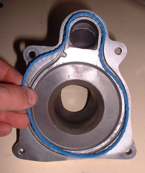 To install it on the water log, you need a specially shaped neoprene-like seal. Mine came with the master rebuild kit, and it’s a good thing, since the old seal needed to be removed from the groove to clean up a little oxidation and antifreeze deposits. It crumbled when I tried to take it out.