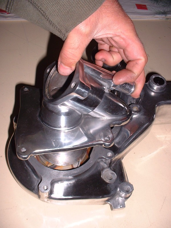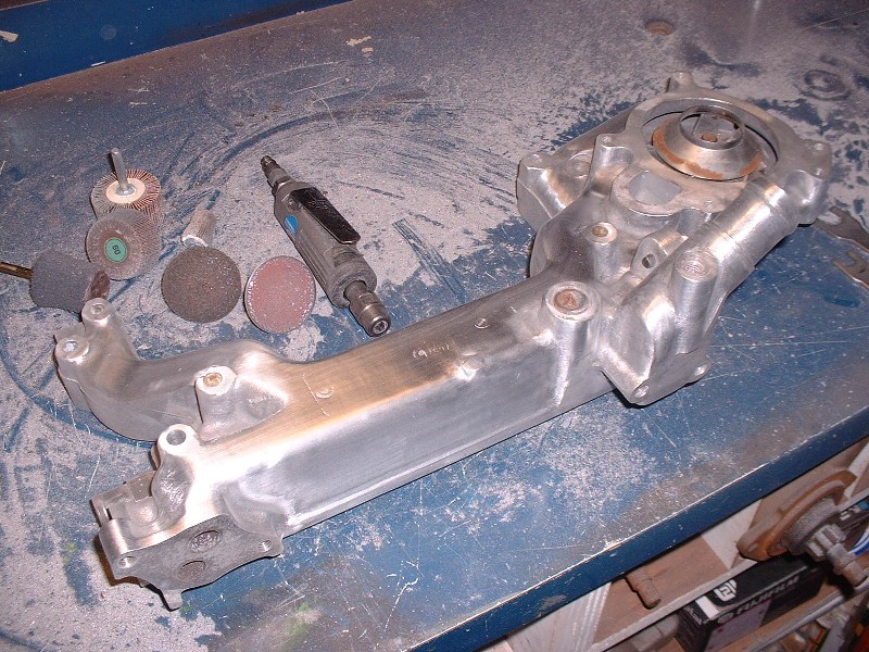 Next came a task I was not looking forward to. Polishing the water pump/log. For those who aren’t familiar with the N* configuration, the water pump is pressed into a huge aluminum water manifold that bridges the two cylinder banks at the back of the engine. It’s so long that many people refer to it as the water log. Here’s what it looks like off the engine.