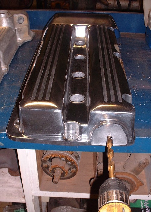 The first step was to measure the location of the center of the hole on the OEM cam cover and transfer it onto the new cam cover as accurately as possible. It’s not rocket science, but there’s a monkey wrench thrown in for good measure. The OEM cover doesn’t sit flat on the workbench because of a gasket flange that protrudes below the bottom, part way around. So it wobbles as you try to measure the height of the hole. Anyways, it’s not super critical at this stage as you’ll soon see, so I drilled a pilot hole once I was satisfied.
