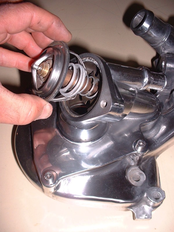 Next up is the thermostat itself. Interestingly, this T-stat has a small vent hole drilled though the shroud already… almost like they knew it would be a challenge to bleed the air out of this monster.