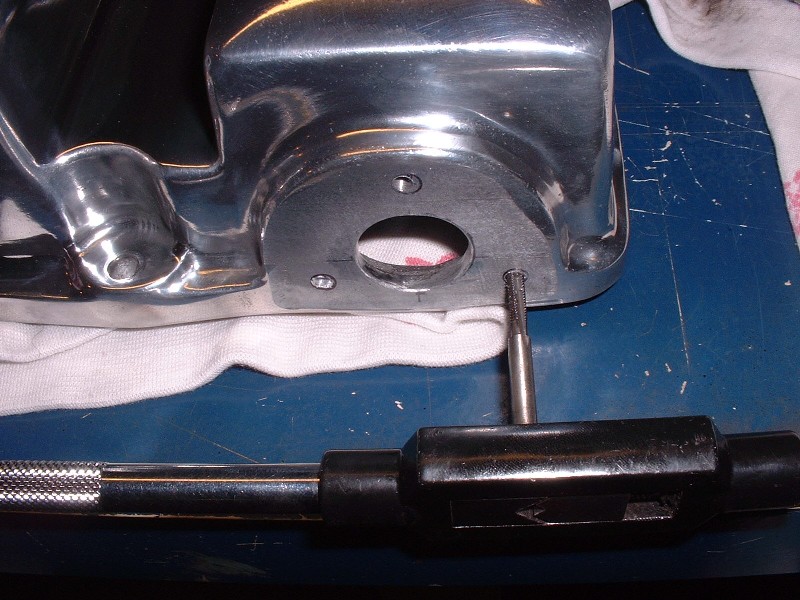 Remove the cam cover again and then drill and tap them to about ½” deep. Drill size: 1/8” diameter; tap size: M4 x 0.7. Even at that depth, the holes don’t penetrate through the material of the cover so no sealant is required, however thread locker is used on the screws.