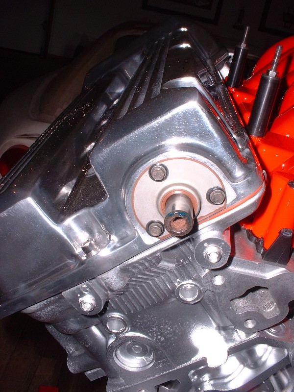 Once the pilot hole was drilled, I worked my way up to a ½” bit and then ground the hole to about 5/8” using a die grinder. I then installed the neoprene gasket, test fitted the cam cover and torqued the cam cover bolts to spec (89 in-lb). You need the gasket since it compresses to about 1/16” thick. This showed me that my original hole was off center by about 1/8” height-wise but at least I could now measure exactly where the hole had to be. To do this, I left the cam cover on and slid a large washer with a ½” ID and 1” OD onto the shaft and traced the outline onto the cover. Once the cover was removed again, I was able to grind the hole to 7/8” diameter (same as OEM), concentric to the correct center. Here’s what it looked like, torqued down, after getting the hole in the right location: