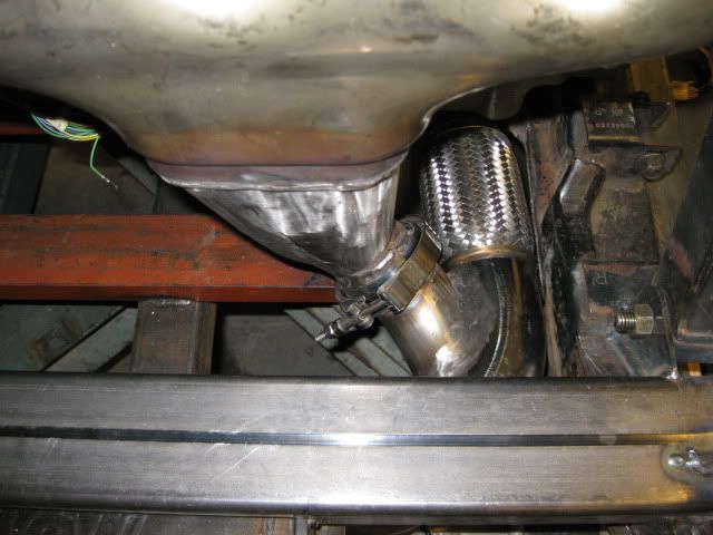 The next step is to slide the engine/tranny/cradle back under the car and finish welding the flexible section, the 3" section going into the muffler and the two tail pipes.