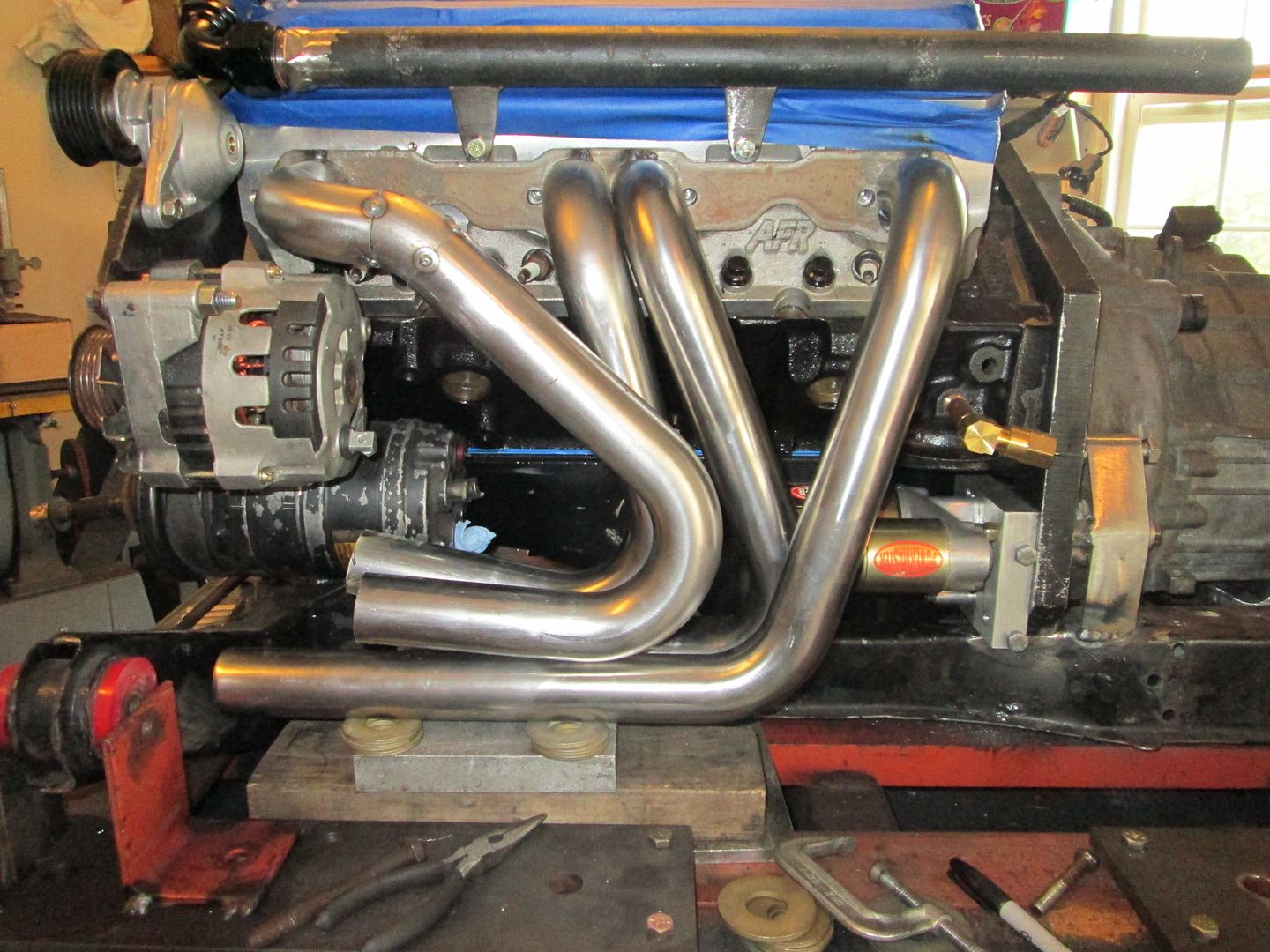 The front header is rough mocked up, still need to finish trim/form the primaries to the flange and then work on the collector. Notice I did have to mod the #1 primary for alternator (used a bend from some other 1 3/4" tubing I had on the shelf).