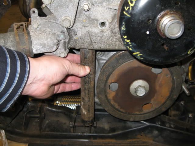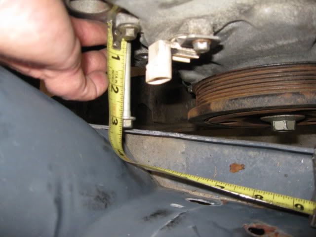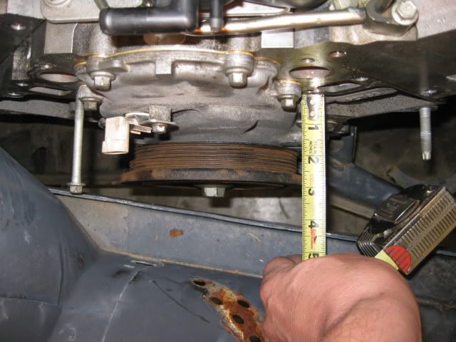 The other thing to take note of is the pump pulley is centered (vertically) between the outer most water pump bolts. With the engine as low as reasonably possible, the top of the frame rail is level with the bottom most water pump bolt. So if the engine was slightly higher a custom pulley could be designed to help it clear a slightly modified frame rail. This pulley would need to have a very small diameter above the frame rail and then enlarge for the belt portion.