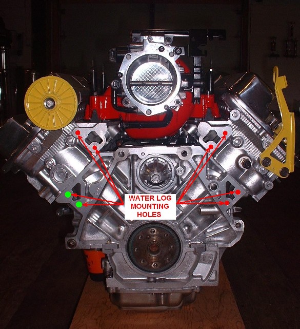 The next step involves having some RTV handy since some of the water log mounting bolts penetrate into the water jacket. I was curious to which ones needed the RTV and decided to shine a light into the four mounting holes on the engine block and the four in the cylinder heads to see. I was surprised to find that only two of them did, so I imagine GM specified RTV on all of the bolts to make things easy on the assembly line. The two that needed it on my block are the ones highlighted in green, the red ones were fine, but I applied RTV to all the bolt threads just in case: