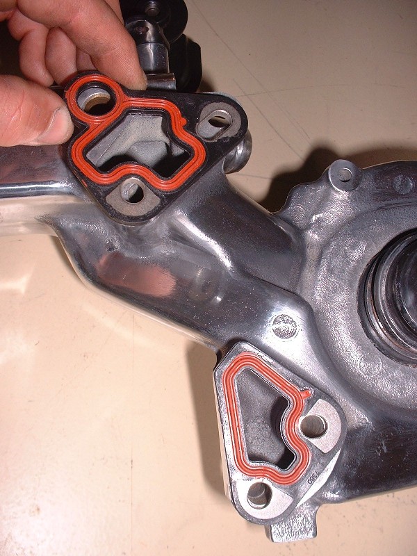 Apart from the boltholes, the way the water passages seal up against the block and heads is with a metal gasket that has a neoprene-like seal embedded on both sides. It’s a little tricky to get all four seals on the log and get it up to the block without the seals falling all off since nothing captures them. The trick is to slide all eight mounting bolts through the log and hang the seals on them.