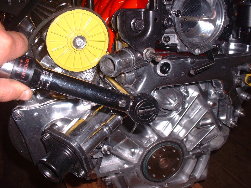 Another complication is that you must hang the little water pump belt off the cam pulley and make sure as you raise the log up to the engine, that you slip the water pump pulley into the belt loop. If you don’t do this, you’ll soon find out that there isn’t enough room between the snout of the pump pulley and the block to install the belt. I know this first hand. Needless to say, lifting this contraption up to the block took two hands so there aren’t any pictures of it going into place. Here it is though, in the process of being torqued down. All eight get torqued to 18 lbft.