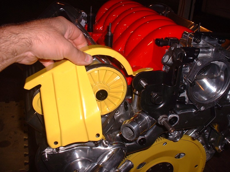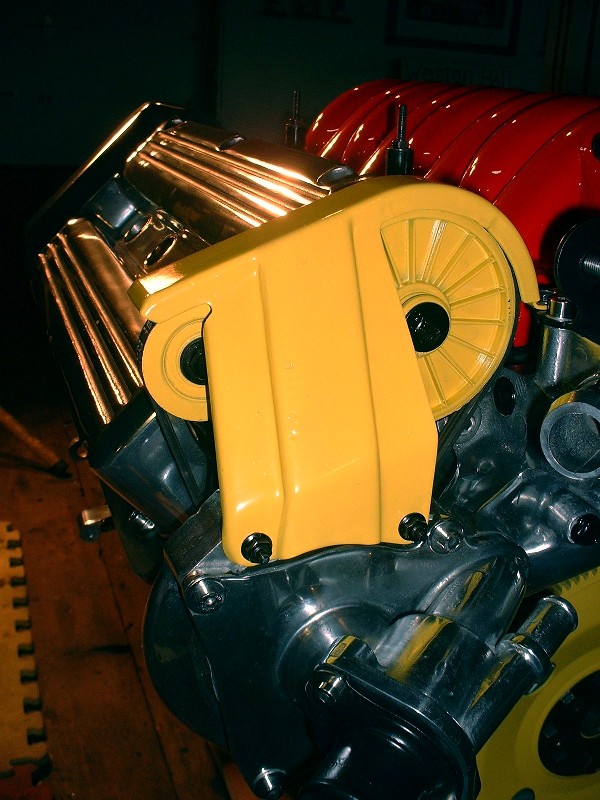 Finally to keep those probing fingers safe from whirling belts and pulleys, here’s the little pulley guard that mounts to the free end of the two tensioner mounting studs mentioned earlier.