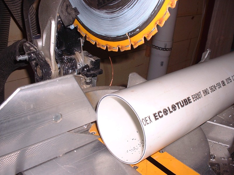 I didn’t get any pictures of the rear crank seal by itself, but the seal is quite innovative in that it’s actually a combination metal sleeve and a typical elastomeric axial shaft seal with a garter spring. The metal sleeve gets driven onto the crankshaft flange with an interference fit, renewing the journal surface on the flange that the old seal rode on by covering it up. The new seal is sized for the diameter of the sleeve, not the diameter of the crank flange. The sleeve and the seal are inseparable since the sleeve is formed with small flanges on both ends at the factory once the seal is slid on. It’s great because your new seal isn’t riding on the old worn surface. The trouble is that to get the sleeve pressed onto the crankshaft, you need to buy, rent, or make a special tool. Stealing an idea from PFF’er WAWUZAT, I made a tool from a piece of 4” PVC drainage pipe and some 1/8” cold rolled steel plate. I cut a piece of the PVC pipe about 2” in length: