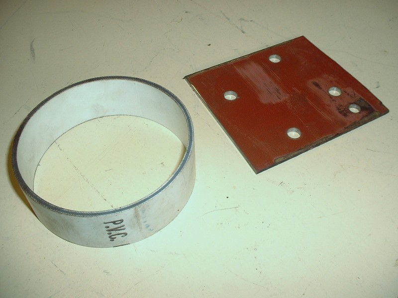 The PVC pipe is exactly the right diameter to contact the outer sleeve flange of the seal assembly. So, to be able to apply even pressure to the pipe while installing the sleeve, I used the Caddy flex plate spacer to trace the outline of four of the eight crankshaft bolt holes onto a 4” X 4” piece of steel plate: